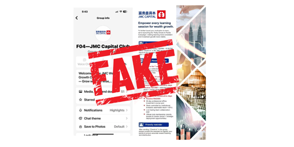 Recently, we have again discovered that some criminals have fraudulently used the names, trademarks and brands of JMC Capital Group Limited and/or its subsidiaries (hereinafter referred to as "JMC", "we", "us" or "our"), including "JMC", "JMC Capital", etc., to forge corporate promotional videos/articles on the WhatsApp public group, and were involved in illegal fundraising, online fraud, false product promotion, etc.
